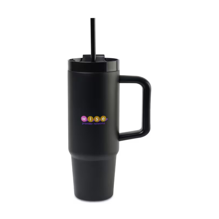 30 Oz Promotional Adrian Travel Tumblers with Straw deliver reliable temperature control and smart functionality for busy routines. Crafted with double-wall stainless steel and vacuum insulation, this tumbler keeps beverages hot or cold while you’re commuting, traveling, or spending the day out. The rotating hybrid lid allows you to switch between straw sipping for cold drinks and a thru-sip opening for hot beverages, all while staying leak-resistant. A sturdy side handle adds comfort and control, and the tapered design ensures a perfect fit in most cup holders. With a generous 30-ounce capacity, this tumbler is made for hydration that lasts.Looking for more? Explore our collection of metal mugs & tumblers  right away.Get free design, free online proofs and fastest turnaround offers.