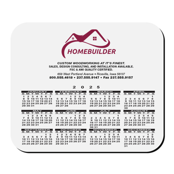 Make your promotions last year-round with these 8x9.5 inch customized hard surface calendar mouse pads. With a slim 1/16 inch base, they are lightweight and easy to distribute at events while still providing dependable use. The built-in yearly calendar makes them a functional desktop tool, while your logo is displayed in vivid full color beneath a protective finish. The hard textured top ensures smooth tracking for optical and roller ball mice, adding daily practicality. Ideal for tradeshows, direct mail campaigns, or client giveaways, these mouse pads are a cost-effective way to keep your branding in sight every single day Order these mouse pads right away to get free design, free online proofs and fastest turnaround offers.