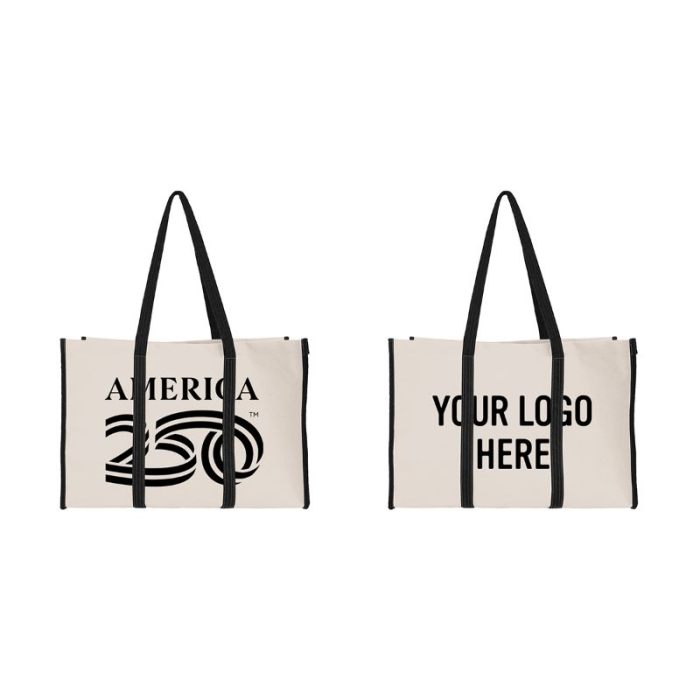 AMERICA250™ Personalized Recycled Canvas Wrap Tote Bags combine sustainability, durability, and style. Crafted from 14 oz. recycled natural canvas with reinforced 10 oz. canvas handles and trim, these totes are strong, eco-friendly, and built to last. The spacious main compartment makes it perfect for carrying books, groceries, or daily essentials, while 24" handles provide comfortable carrying options. Fully customizable, these tote bags are ideal for corporate giveaways, events, or retail promotions. Spot clean and air dry for easy maintenance. Proudly made in the USA, they’re a practical and sustainable choice for any occasion.Looking for more? Explore our collection of America250 products  right away.Get free design, free online proofs and fastest turnaround offers.