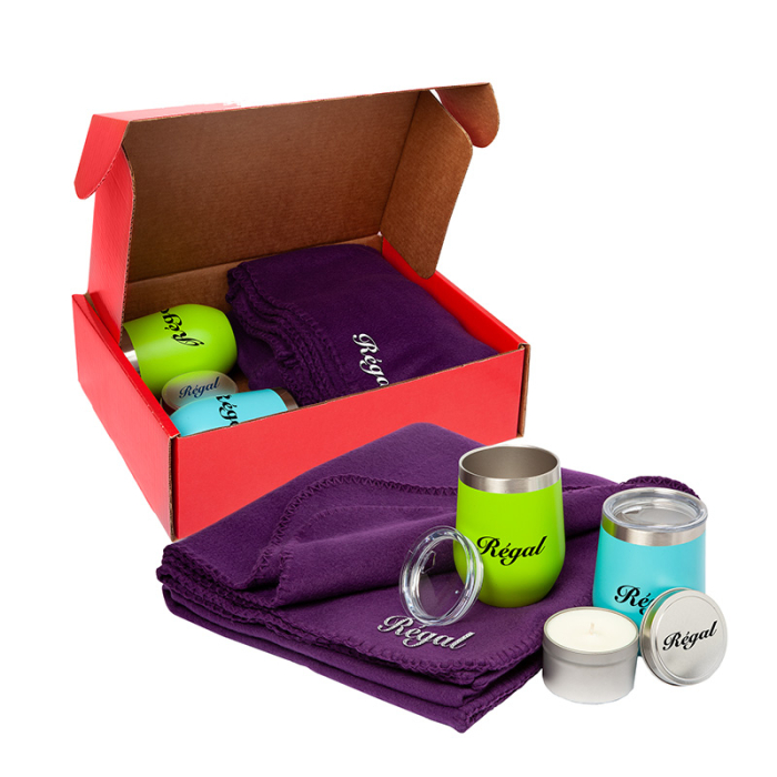 Custom Comfort Box Sets transform any evening into a moment of relaxation while delivering a branded message. This thoughtfully curated gift set includes a plush fleece throw blanket featuring your logo, two 12 oz. vacuum wine cups for versatile beverage enjoyment, and an 8 oz. aromatherapy candle tin that fills any space with soothing fragrance. Beautifully packaged, this set makes an ideal gift for corporate clients, employees, or loved ones, combining elegance, comfort, and practicality in one memorable presentation. Show your appreciation in a way that pampers and impresses with every detail.Looking for more? Explore our collection of  gift sets right away.Get free design, free online proofs and fastest turnaround offers.
