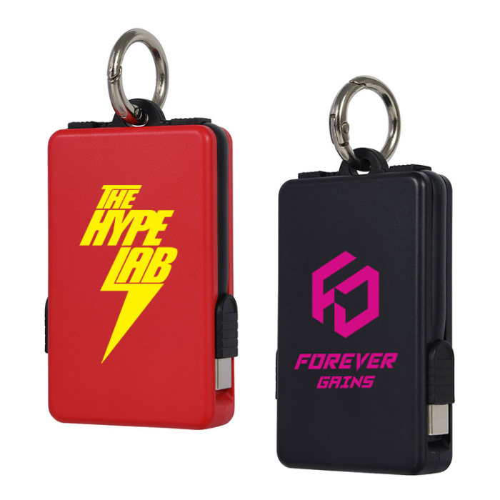 The Custom Esprit 2000mAh UL Listed Power Bank with Built In Cables is a practical and travel friendly charging accessory designed for everyday convenience. Its compact 2000mAh lithium battery provides dependable backup power for smartphones and small electronic devices, making it ideal for short trips, events, or emergency use. The integrated USB-C and Lightning cables eliminate the need to carry additional cords, allowing users to charge multiple device types with ease. When not in use, the cables store neatly within the unit, maintaining a streamlined and clutter free design. A built in keyring adds portability by allowing the power bank to attach easily to bags, keys, or backpacks. With UL Listing for trusted safety standards and a slim pocket sized profile, this power bank is well suited for corporate giveaways, promotional campaigns, and everyday carry. Each unit also includes a printed QR code for quick access to updated user instructions, enhancing overall usability.Looking for more? Explore our collection of  power banks right away.Get free design, free online proofs and fastest turnaround offers.