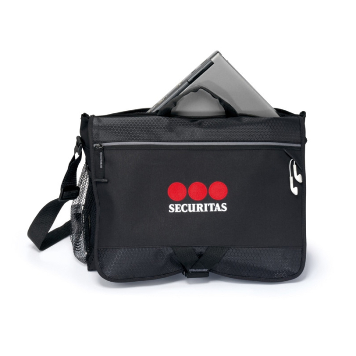 Custom Focus Laptop Messenger Bags are designed for professionals, students, and travelers who need reliable storage for their devices and everyday gear. The padded back computer pocket safely fits laptops up to 15.4 inches, helping protect important data and equipment while commuting or traveling. A large main compartment provides generous room for documents, notebooks, and additional work essentials. The front zippered pocket includes a convenient earphone outlet for MP3 players, while another zippered pocket is sized to fit tablets up to 10 inches with a case. A multi-function organizer located beneath the front flap keeps small accessories, cables, and personal items within easy reach. Complete with a side mesh pocket for water bottles, this messenger bag combines functionality, organization, and style for everyday use.Looking for more? Explore our collection of messenger bags right away.Get free design, free online proofs and fastest turnaround offers.
