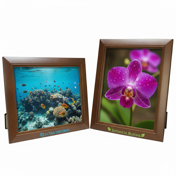 Elevate every moment with natural elegance.A premium wood frame that keeps your brand beautifully displayed.