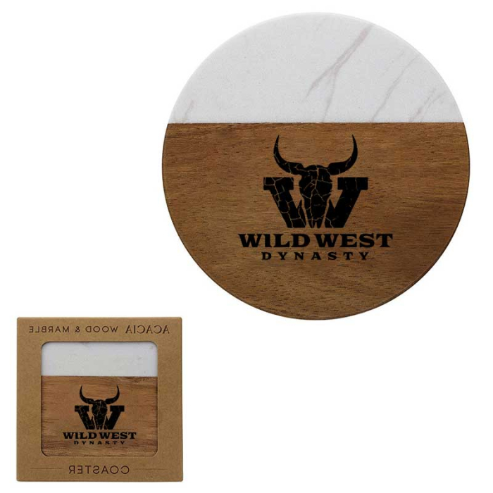 Custom Imprinted Acacia Wood & Marble Coasters combine natural elegance with everyday practicality, making them a standout promotional item. Each coaster is crafted from durable acacia wood paired with cultured marble, offering both beauty and long-lasting performance. Acacia’s natural water-resistant and antimicrobial properties make these coasters ideal for protecting tabletops in homes or offices. The unique variations in wood color, grain, and size give each coaster its own charm, creating a distinctive set that adds sophistication to any setting. Perfect for corporate gifts, promotional giveaways, or event keepsakes, these coasters allow your brand to be seen and remembered in style.Looking for more? Explore our collection of  coasters right away.Get free design, free online proofs and fastest turnaround offers.