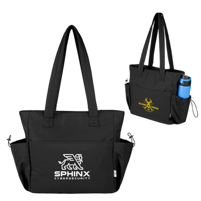 Custom Imprinted Arthur Recycled Tote Bag is the perfect blend of style, sustainability, and functionality for professionals on the go. Crafted from T400 recycled polyester with a durable polyester lining, this tote supports eco-conscious branding while offering long-lasting performance. The zippered main compartment includes a secure interior pocket, complemented by a front slip pocket and two adjustable side elastic pockets for organized storage. A padded laptop sleeve safely accommodates most laptops up to 16 inches, making it ideal for work, school, or travel. The integrated trolley strap ensures effortless attachment to luggage handles, enhancing convenience during commuting or trips. Lightweight, stylish, and sustainable, this tote provides ample space for branding while delivering daily utility and professional appeal.Looking for more? Explore our collection of tote bags right away.Get free design, free online proofs and fastest turnaround offers.