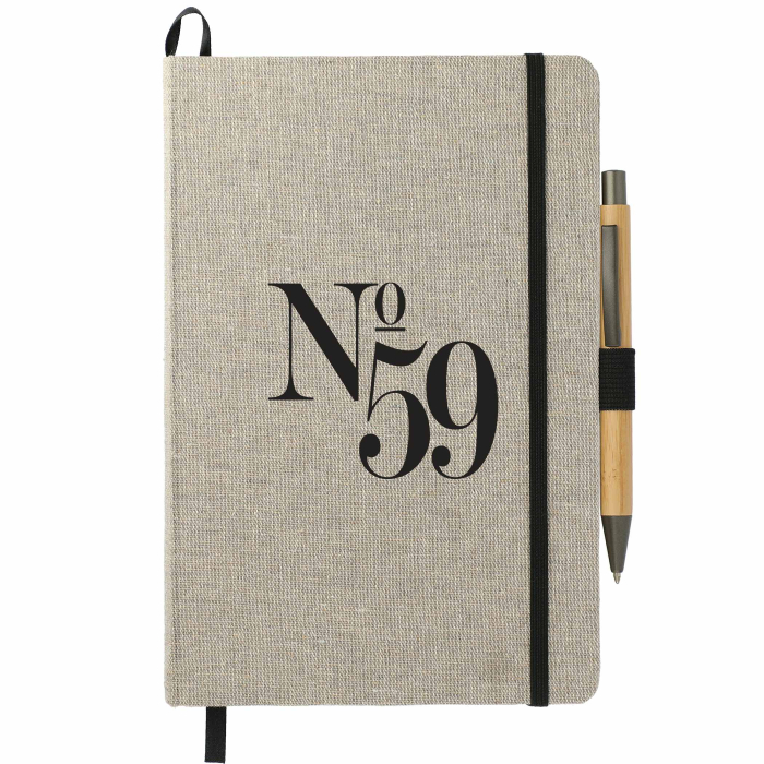 Custom Imprinted Cotton Bound Journal Sets offer a thoughtful and practical promotional gift for offices, events, and conferences. The 5.5" x 8.5" journal features a durable recycled cotton hard cover that delivers a natural look while supporting eco-conscious choices. Inside, 80 sheets of FSC® Mix cream lined paper provide ample space for note-taking, planning, and daily journaling. Functional details such as the natural color elastic closure, pen loop, and ribbon page marker help keep everything organized and accessible. A back document pocket offers additional storage for loose papers or business cards. Paired with a bamboo quick-dry gel ballpoint pen, this set provides a complete and stylish writing solution.Looking for more? Explore our collection of custom journals right away.Get free design, free online proofs and fastest turnaround offers.