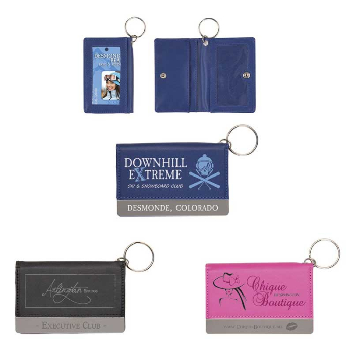 Custom Imprinted Deluxe Bi-Fold Wallets offer practical organization in a sleek, professional design. Featuring two clear window ID panels—one conveniently placed on the back and another inside—this wallet allows for quick access to identification when needed. The interior includes two card slots for essential cards, while a metal split keyring with a reinforced metal grommet adds extra functionality for keys. Finished with a secure snap-tight closure and a shiny metal accent panel, this wallet delivers both durability and visual appeal. Ideal for corporate giveaways, employee gifts, and promotional events, it’s an everyday accessory that keeps your brand close at hand.Looking for more? Explore our collection of wallets  right away.Get free design, free online proofs and fastest turnaround offers.