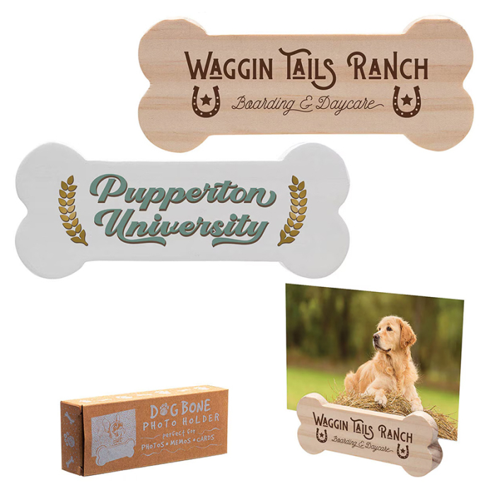 Custom Imprinted Dog Bone Photo Holders offer a charming and versatile way to display photos, notes, and important cards. Designed in a playful bone shape, each holder can securely display photos, memos, business cards, table place cards, or appointment reminders. Crafted from natural pine wood, every piece has a unique grain pattern that adds rustic appeal. Each holder comes packaged in a decorative kraft box, making it gift-ready for events, pet promotions, or giveaways. Ideal for pet stores, veterinary clinics, animal shelters, and pet-themed events, these photo holders combine functionality with memorable branding.Looking for more? Explore our collection of  picture frames right away.Get free design, free online proofs, and fastest turnaround offers.