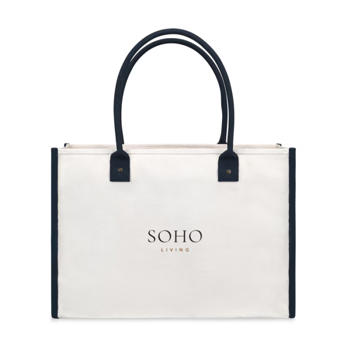 Custom Imprinted Grande Market Street Totes offer expanded space without sacrificing classic style. Crafted from durable canvas, this all-purpose tote transitions seamlessly from the office to the market and everywhere in between. The generous front panel provides plenty of room for bold, horizontal logos or inspirational messaging, making your customization stand out. Rolled padded handles ensure comfortable carrying by hand, over the forearm, or on the shoulder, while antique brass rivet accents add a refined, vintage touch. Finished with a practical interior pocket and PVC-free materials, this tote is a versatile choice for events, retail, and everyday brand exposure.Looking for more? Explore our collection of tote bags right away.Get free design, free online proofs and fastest turnaround offers.