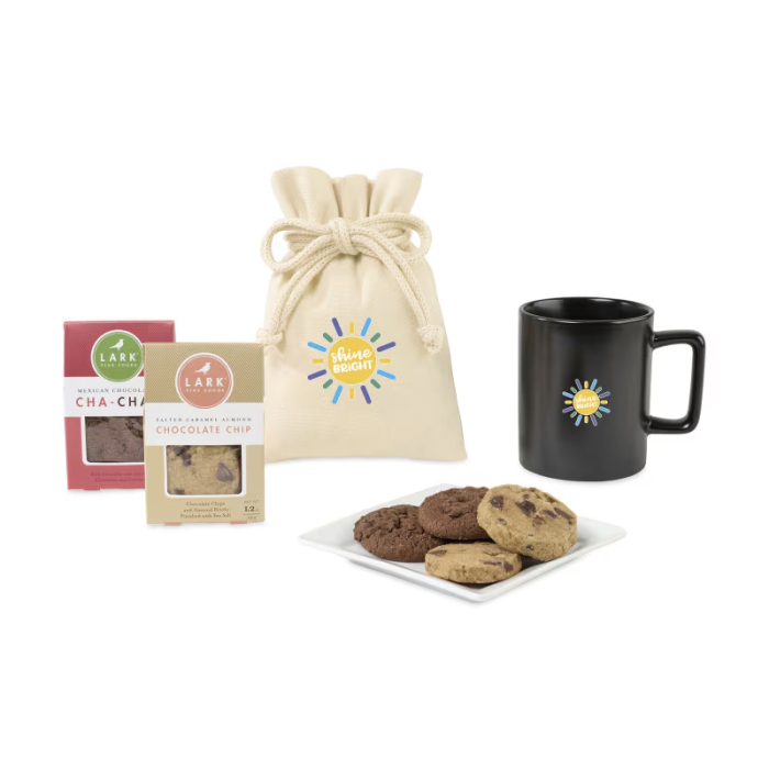 Delight your team with the Custom Imprinted Lark Welcoming Cookies Treat Mug Stuffer. Each gift includes a ceramic mug housed in a protective kraft box and two tasty Lark cookies packaged inside a reusable canvas drawstring bag. Perfect for welcoming new hires, these mug stuffer gifts help recipients feel connected to your company culture from day one. They are also a thoughtful way to show appreciation to hardworking employees or thank attendees at events, conferences, or seminars. Featuring cookies from Lark Fine Foods, a woman-owned brand, and made in the USA, these treats combine quality, indulgence, and empowerment. Optional greeting cards can be included to make your gift even more personal and memorable.Looking for more? Explore our collection of custom cookies right away.Get free design, free online proofs and fastest turnaround offers.