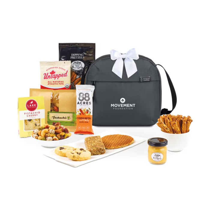 The Custom Imprinted Out To Lunch Gourmet Treats Cooler is a thoughtful and sustainable gift that combines eco-conscious design with delicious indulgence. Crafted from recycled fabrics and webbing made from plastic bottles, this PVC-free cooler holds up to 9 cans while keeping your snacks fresh and secure. Inside, recipients will enjoy a carefully curated selection of gourmet treats, all made in the USA, including shortbread cookies, dipping pretzels with mustard, nut mix, a cinnamon oat seed bar, and a maple energy waffle. Packaged in an eco-friendly gift bag, this cooler is perfect for corporate gifting, employee appreciation, or special events. Add a splash of personalization with a complimentary ribbon and one-color imprint, making your gift as memorable as it is sustainable.Complimentary ribbon in your choice of color (white included by default) Looking for more? Explore our collection of cooler bags right away.Get free design, free online proofs and fastest turnaround offers.