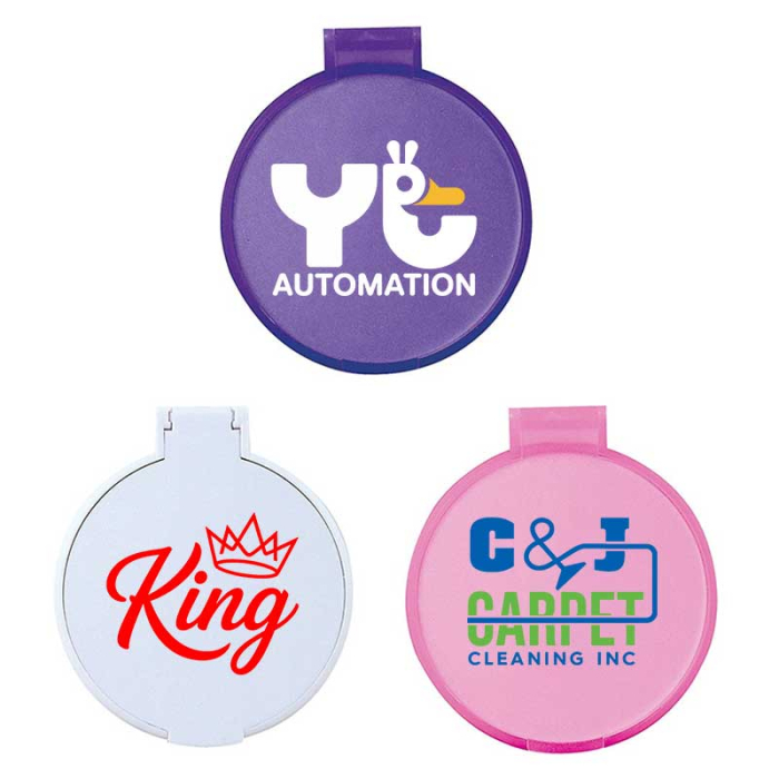 Custom Imprinted Pocket Compact Mirrors make a stylish and practical promotional gift for clients, employees, or event attendees. This round 2 3/4" x 2 3/8" mirror is compact enough to fit into purses, pockets, or handbags, making it a convenient accessory for everyday touch-ups. Offered in a variety of colors, it allows you to match your brand or event theme while keeping your logo visible in a high-use, high-impact item. Perfect for beauty industry events, corporate promotions, or retail giveaways, this pocket mirror combines usefulness with elegance. Add a one-color imprint to showcase your brand on an item recipients will use repeatedly, ensuring long-lasting brand visibility.Looking for more? Explore our collection of  compact mirroirs right away.Get free design, free online proofs, and fastest turnaround offers.