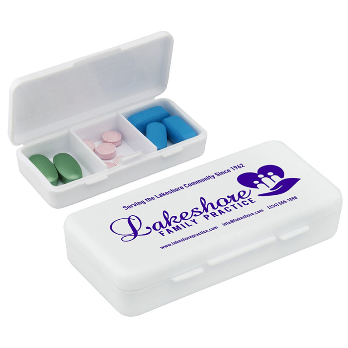 Custom Printed 3 Compartment Pillboxes offer a simple and reliable way to organize daily medications or supplements. The three-compartment layout provides flexibility for separating pills by time or type, helping users stay on schedule with ease. Compact and lightweight, this pillbox is perfect for home use, work, or travel. Its practical design makes it a thoughtful and budget-friendly promotional item for pharmacies, healthcare providers, wellness programs, and events. Add your logo to create a useful giveaway that delivers daily brand exposure.Looking for more? Explore our collection of pill boxes right away.Get free design, free online proofs and fastest turnaround offers.