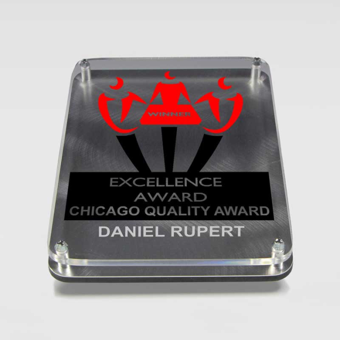 Celebrate achievements with a modern floating acrylic award that combines metal and acrylic for a striking display.