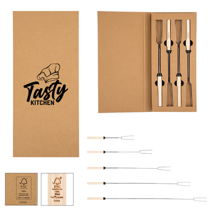 Custom Printed Hot Dogs and S’Mores Skewer Sets are a must-have for campfires, backyard gatherings, and outdoor events. Each set includes four stainless steel, double-pronged skewers designed to securely hold hot dogs, marshmallows, or snacks without spinning. The extendable wooden handles keep hands safely away from flames while offering comfortable control during roasting. Made with FSC® certified wood, these skewers support responsible forestry and add an eco-conscious touch to your promotional lineup. Packaged neatly in a paper card box, this reusable set makes a fun, practical giveaway for summer promotions, camping brands, outdoor events, and family-friendly campaigns that leave a lasting impression.Looking for more? Explore our collection of BBQ sets right away.Get free design, free online proofs and fastest turnaround offers.