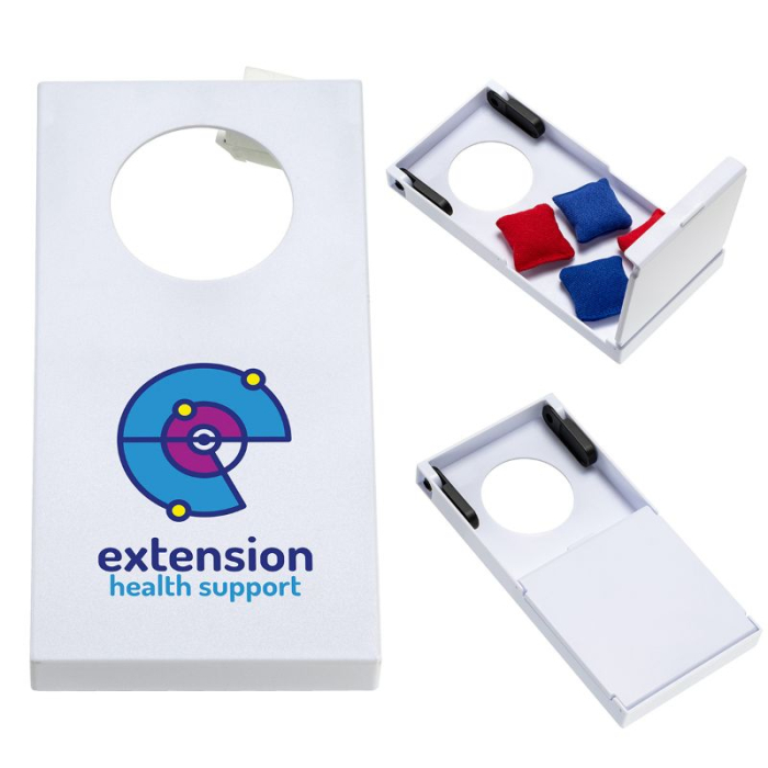 Custom Printed Mini Tabletop Cornhole Game brings classic cornhole excitement to small spaces with a compact design ideal for desktops, offices, and events. Made from durable ABS plastic, this mini game features a folding board that sets up easily and stores quickly when not in use. Four included mini bean bags let players start tossing right away, creating a playful break activity that boosts engagement and encourages friendly competition. Its fun, interactive design makes this tabletop game a unique promotional giveaway for trade shows, employee events, client gifts, or branded campaigns. With your custom imprint added, it’s a memorable item that keeps your brand top of mind during every play session.Looking for more? Explore our collection of childrens toys right away.Get free design, free online proofs and fastest turnaround offers.