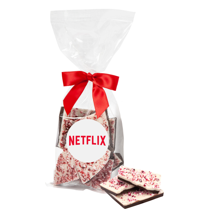 Add a seasonal favorite to your campaigns with Custom Printed Peppermint Bark in Mug Drops. Each stand-up mug drop bag is filled with rich peppermint bark in assorted shapes and broken pieces, delivering classic holiday flavor in every bite. Designed to hang neatly over mugs or stand upright for display, these festive treats showcase your logo on a custom printed label and finish with your choice of bow color. Sealed at both ends to maintain freshness, they’re perfect for holiday promotions, employee appreciation, customer thank-yous, and seasonal events. Festive, flavorful, and gift-ready, they help your brand spread cheer all season long.Looking for more? Explore our collection of custom mints right away.Get free design, free online proofs and fastest turnaround offers.