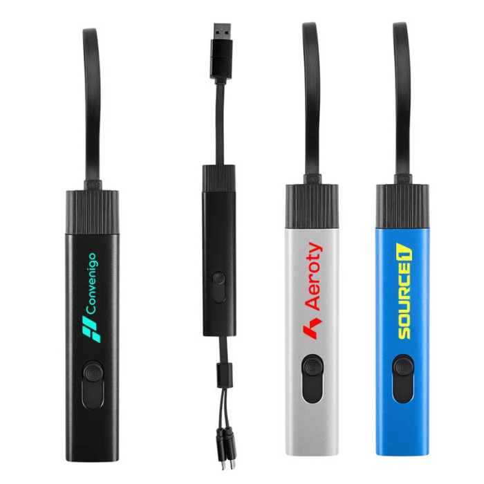 Custom Printed Recycled Aluminum Retractable Travel Charging Cables are a sleek, eco-conscious solution for charging multiple devices on the go. Crafted with a durable recycled aluminum housing, this compact charger supports Apple® 8-Pin, Micro USB, and Type-C devices, eliminating the need to carry multiple cords. Dual USB-A and Type-C inputs allow easy connection to various power sources, while the 15W output delivers reliable performance. The smart retractable design keeps cables tangle-free, extending only when needed and retracting neatly with a simple slide button. Ideal for travel, work, events, or everyday use, this charging cable offers excellent portability while keeping your brand visible in tech-forward, sustainable style.Looking for more? Explore our collection of charging cables & adapters  right away.Get free design, free online proofs and fastest turnaround offers.