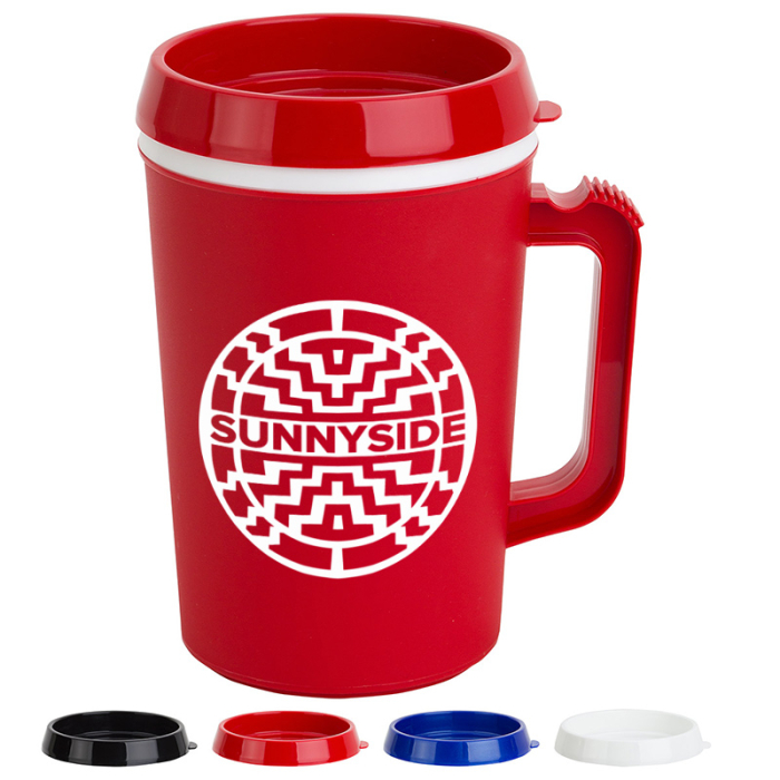The Solera Mug offers a generous 34 oz capacity with double-wall polypropylene construction to keep beverages hot or cold. It features a slip-on lid with a straw hole for easy sipping and is available in black, blue, red, and white lid colors. Microwave and top-rack dishwasher safe, BPA-free, and FDA certified for safe use. Order these plastic mugs right away to get free design, free online proofs and fastest turnaround offers.