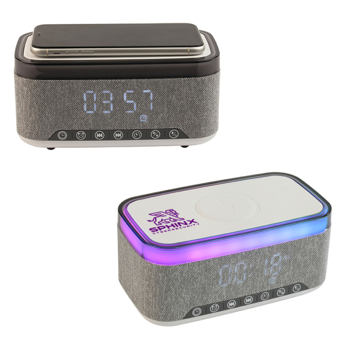 The Custom Printed Sunset 20W Stereo Speaker brings premium audio and smart convenience together in a compact, modern design. Its 20W stereo output with woofer delivers rich sound, while the integrated 15W wireless charger keeps phones powered throughout the day. The digital clock with snooze function makes it ideal for desks or nightstands. Seven natural white-noise settings support relaxation or focus, and RGB light modes create an inviting atmosphere. A built-in 1200mAh battery allows portable use anywhere. Each unit includes a printed QR code linking to the latest user manual, making setup simple and intuitive.Order these wireless speakers right away to get free design, free online proofs and fastest turnaround offers.