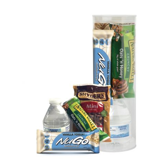 • 9 3/4" x 3 1/8" tube packed with a small bottle of water, two granola bars, and a bag of pretzels