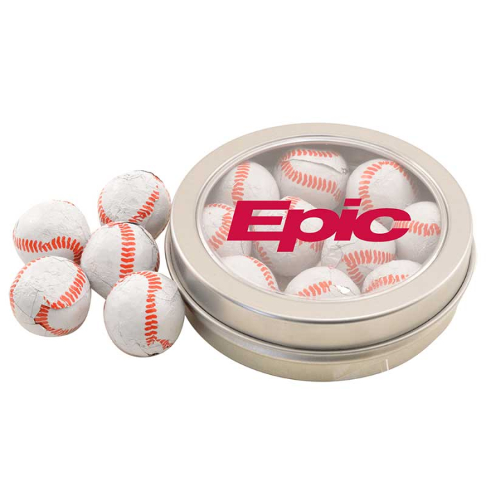 Custom Round Tins with Chocolate Baseballs