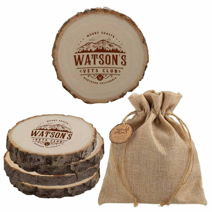 Custom Woodlands Coaster Sets combine natural beauty with practical tabletop protection. Each coaster is crafted from Poplar wood, showcasing unique variations in color and size that make every piece one-of-a-kind. Over time, repeated use develops a weathered patina, enhancing the coaster’s charm and adding warmth to any setting. Packaged in eco-friendly, reusable burlap drawstring bags made from natural jute, these sets are ready for gifting, corporate promotions, or special events. Perfect for those who appreciate rustic style, sustainability, and practicality, these coasters allow your brand to be highlighted in a thoughtful and memorable way while providing recipients with a functional, stylish accessory for their home or office.Looking for more? Explore our collection of unique and stylish coasters right away.Get free design, free online proofs and fastest turnaround offers.