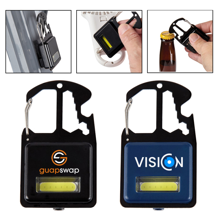 Customized Bryson Mini Multi-Tool COB Work Light packs impressive functionality into a compact, easy-to-carry design. Equipped with a powerful 100-lumen COB light, it delivers reliable brightness for low-light tasks, roadside emergencies, or campsite use. Beyond lighting, this versatile tool features flat head and Phillips screwdriver bits stored conveniently in the back, along with hex tools and a bottle opener for added everyday utility. A built-in magnet allows hands-free operation on metal surfaces, making it ideal for quick repairs or workspace lighting. With a split ring and dual carabiner spring clip, the Bryson easily attaches to keychains, backpacks, or belt loops. This practical and rugged multi-tool work light makes a smart promotional giveaway that keeps your brand close at hand.Looking for more? Explore our collection of  multi-tool flashlights right away.Get free design, free online proofs and fastest turnaround offers.