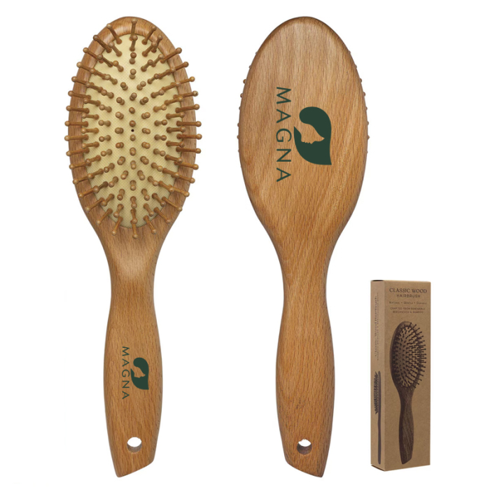 Customized Classic Wood Hairbrushes combine natural materials with practical design for an eco-conscious grooming solution. Made from durable beechwood and renewable bamboo, these brushes are built to last while offering a sustainable alternative to plastic. The comfortable oval shape ensures easy handling and maneuverability for daily brushing and styling, while the bamboo bristles help reduce static and frizz and evenly distribute natural hair oils for healthier, shinier hair. Gentle on all hair types, the brush also stimulates scalp circulation to promote hair growth. Ideal for salons, spas, corporate gifts, or promotional giveaways, these hairbrushes provide a functional, stylish, and thoughtful accessory.Looking for more? Explore our collection of personal care products  right away.Get free design, free online proofs and fastest turnaround offers.