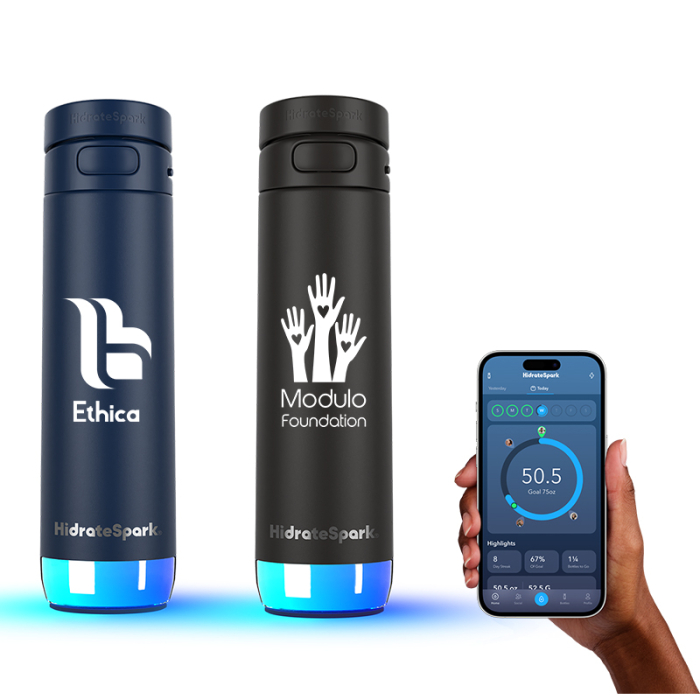 HidrateSpark® 21 Oz Imprinted PRO 2 Bottle with Chug Lid combines smart technology, sustainability, and everyday convenience in one innovative hydration solution. Crafted from premium recycled 18/8 stainless steel, this bottle features double-wall vacuum insulation to keep beverages cold for up to 24 hours. The advanced PRO 2 sensor with SipSense™ technology tracks every sip and syncs seamlessly with the HidrateSpark App, helping users monitor hydration, set personalized goals, and stay motivated with glow reminders and smart notifications. The chug lid delivers fast hydration with a locking, spill-resistant design, hygienic spout cover, and a large built-in handle for grab-and-go ease. Sweat-proof textured powdercoat enhances grip and durability, while USB-C charging provides up to 21 days of battery life. Not for use with hot liquids.Looking for more? Explore our collection of metal water bottles right away.Get free design, free online proofs and fastest turnaround offers.