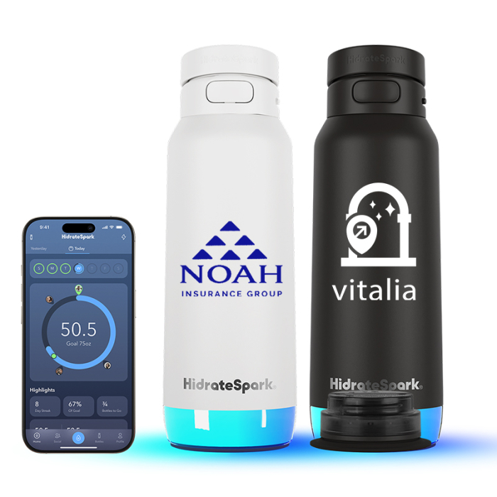 HidrateSpark® 32 Oz Promotional PRO 2 Bottle with Chug Lid is built for high-performance hydration and maximum brand impact. Made from premium recycled 18/8 stainless steel, this smart bottle features double-wall vacuum insulation to keep drinks cold for up to 24 hours. The advanced PRO 2 sensor with SipSense™ technology automatically tracks every sip and syncs with the HidrateSpark App, allowing users to set personalized hydration goals, receive smart reminders, and monitor progress throughout the day. Customizable 360° glow colors, sound alerts, and Apple Find My integration keep the bottle visible and easy to locate. The secure chug lid offers fast hydration, spill resistance, and a built-in carry handle for on-the-go convenience. With USB-C charging and up to 21 days of battery life, this bottle delivers long-lasting engagement. Not for use with hot liquids.Looking for more? Explore our collection of metal; water bottles right away.Get free design, free online proofs and fastest turnaround offers.
