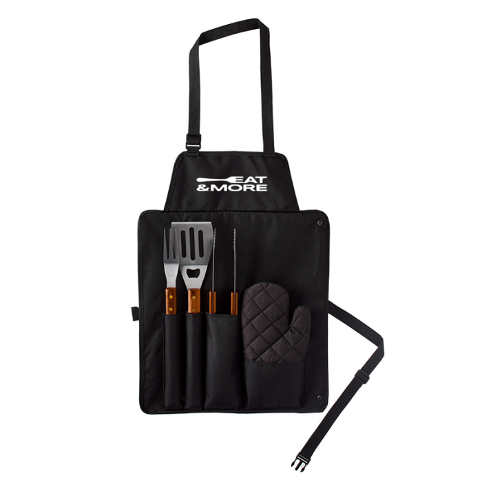 Keep your hands free and grilling station organized with Imprinted BBQ Grill Aprons. This versatile set includes a spatula, fork, tongs, and an insulated cotton mitt, all stored neatly in the specially designed rPET polyester apron. Multiple pockets keep utensils secure and within reach, while adjustable neck and waist straps ensure a comfortable fit for any griller. The apron is crafted from sustainable rPET polyester and imprinted with your artwork in full color for maximum brand impact. Durable stainless steel tools with hardwood handles make this set a practical, eco-friendly gift for barbecues, company picnics, or client giveaways.Order these aprons right away to get free design, free online proofs and fastest turnaround offers.
