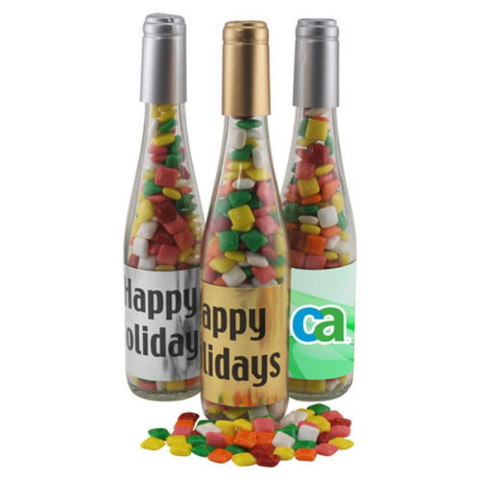Imprinted Champagne Bottles with Mini Chicklets are a unique and memorable way to celebrate any occasion. The 11" recyclable glass bottle is filled with sweet Mini Chicklets, while your choice of label and cap color adds a touch of elegance to the presentation. Compact yet eye-catching, these bottles are ideal for corporate giveaways, client appreciation, employee recognition, or festive celebrations. Combining style, eco-conscious packaging, and a delicious treat, this promotional gift ensures your brand leaves a lasting impression with every “cheers!”