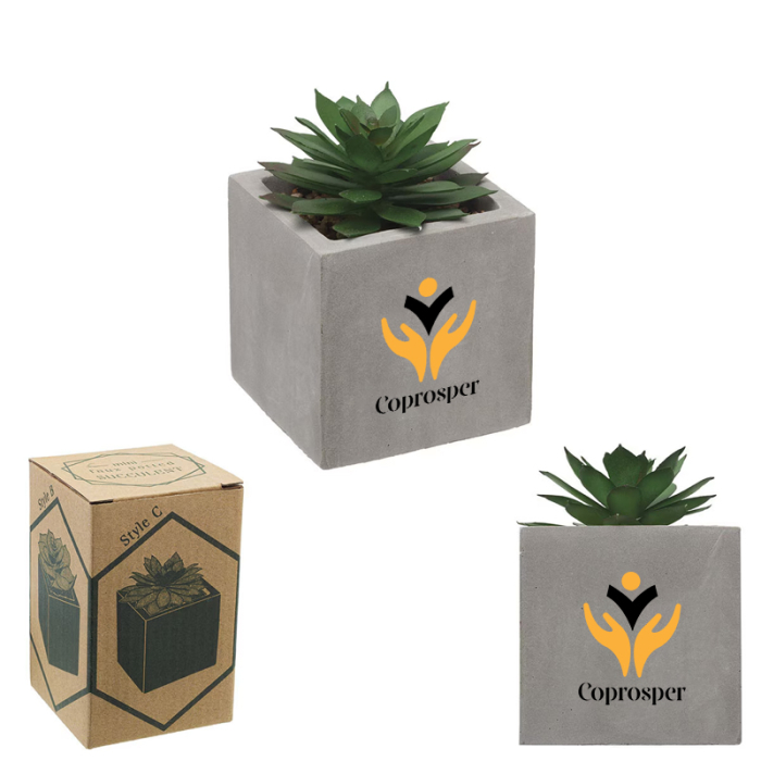 Imprinted Mini Faux Potted Succulents offer a simple way to add visual interest and a natural feel to any space without ongoing maintenance. Each piece features a realistic faux succulent housed in a square concrete pot, creating a clean, modern aesthetic that fits seamlessly into office desks, reception areas, or home workspaces. With four distinct styles available, these mini planters add variety while maintaining a cohesive look. No watering, sunlight, or care is required, making them ideal for busy environments. Perfect for offices, events, and giveaways, this decorative accent delivers long-lasting appeal while keeping your imprint visible every day.Looking for more? Explore our collection of gardening products right away.Get free design, free online proofs and fastest turnaround offers.