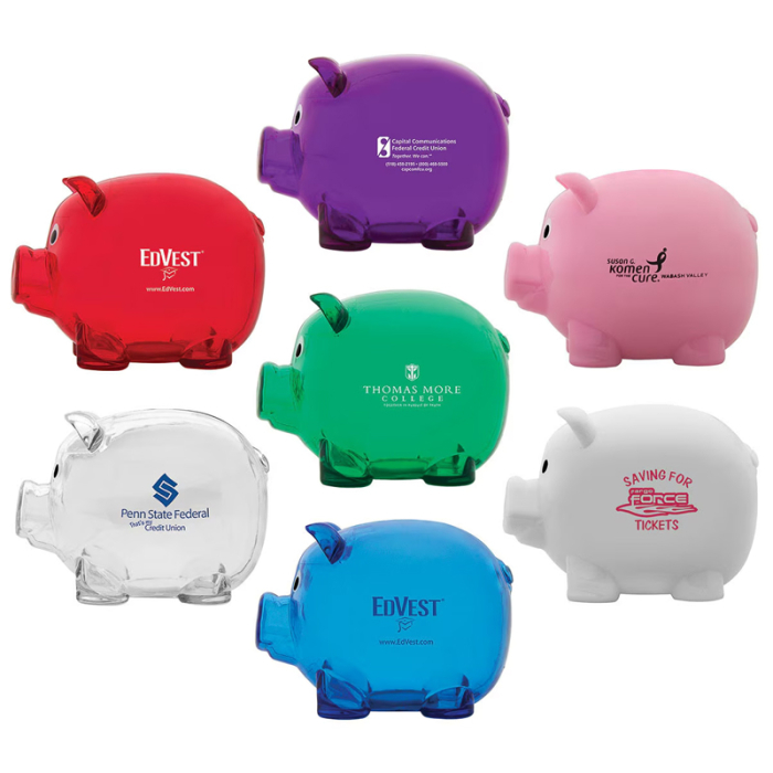 Imprinted Recycled RSAN Mr. Piggy Banks combine environmental consciousness with practical savings. Crafted from recycled materials, each piggy bank is a fun, colorful, and durable way to encourage children and adults alike to save. With seven vibrant colors to choose from, these piggy banks allow you to match your brand or personal style while providing ample space to imprint your logo or message. CPSIA compliant and age-graded for children 3 and up, they meet safety standards while instilling the habit of saving—making them perfect for educational programs, fundraising, or promotional giveaways.Looking for more? Explore our collection of piggy banks right away.Get free design, free online proofs, and fastest turnaround offers.