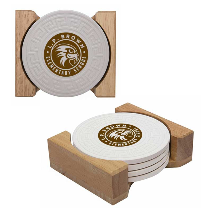 Request a quote to know wholesale savings for Imprinted Round Greek Key Absorbent Stone Coaster Sets.