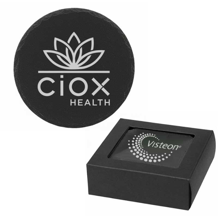 Imprinted Round Slate Coaster Sets offer a sleek and practical way to enhance any tabletop while promoting your brand. Each coaster is made from natural slate and includes protective feet to prevent scratches and damage to furniture. Because slate is a natural material, every piece features unique variations in color and texture, making each coaster truly one-of-a-kind. Available individually or in sets of 4, the coasters are elegantly packaged in onyx presentation boxes, providing a professional and gift-ready appearance. Perfect for corporate gifting, promotional giveaways, or trade show events, these coasters combine functionality, style, and brand visibility in a memorable keepsake that recipients will use and appreciate.Looking for more? Explore our collection of coasters right away.Get free design, free online proofs and fastest turnaround offers.