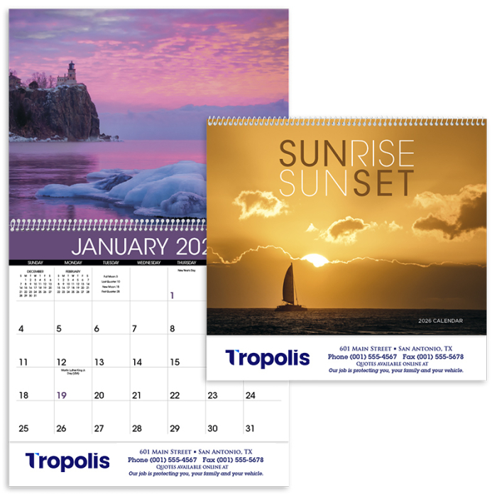 Request a quote to know wholesale savings for these Imprinted Sunrise Sunset Wall Calendars.