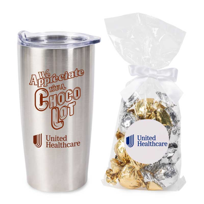 A sweet sip for memorable branding.A 20 oz vacuum tumbler set paired with twist-wrapped truffles for a high-impact gift.