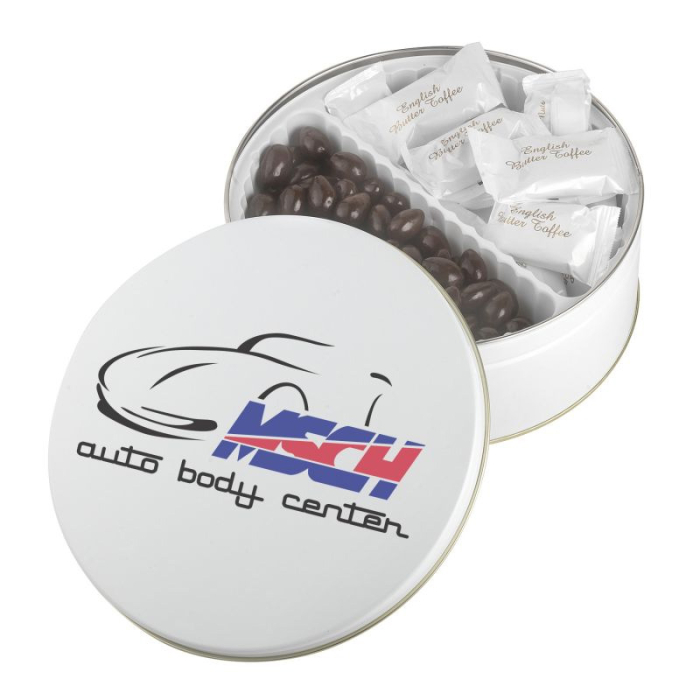 Imprinted Warm Wishes Tins with English Butter Toffee and Dark Chocolate Almonds