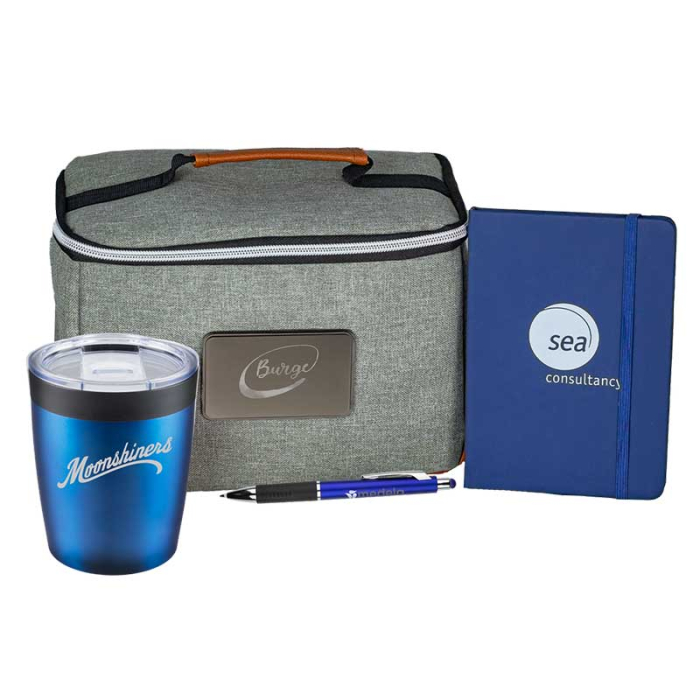 Imprinted Welcome Kits with Mini Tumbler, Journal, Pen, and Tote