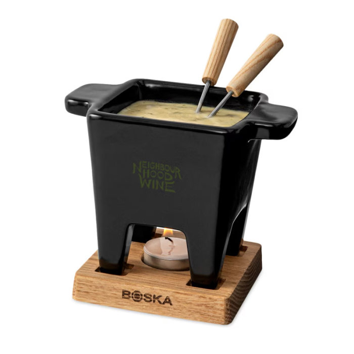 Imprinted Boska Tapas Fondue Nero Sets bring European charm and effortless elegance to small gatherings. Ideal for sharing melted cheese, rich chocolate, or savory dips, this compact fondue set transforms simple ingredients into a memorable experience. The ceramic pot evenly retains heat while the tealight creates a warm, inviting glow at the table. An oak base adds natural character and stability, while stainless steel forks ensure comfortable, precise dipping. Designed with convenience in mind, the pot is microwave-safe and easy to clean, making prep and cleanup stress-free. With premium materials and thoughtful craftsmanship, this fondue set is built to last and backed by Boska’s reputation for lifetime-quality performance—perfect for gifting, entertaining, or branded promotions that feel truly special.Looking for more? Explore our collection of kitchen sets right away.Get free design, free online proofs and fastest turnaround offers.