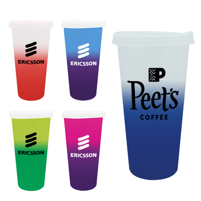 Mood™ Imprinted 26 Oz Tumblers with Lid offer a colorful and engaging drinkware option for your brand. The cup changes color with ice-cold liquids, adding a fun twist to any beverage. Made from durable PP plastic, it includes a frosted PE plastic snap-on lid with a sip-through opening that fits a standard straw. Top-shelf dishwasher safe for easy cleaning. Not recommended for hot beverages, making it perfect for cold drinks at events, parties, and promotional giveaways. Order these plastic tumblers right away to get free design, free online proofs and fastest turnaround offers.