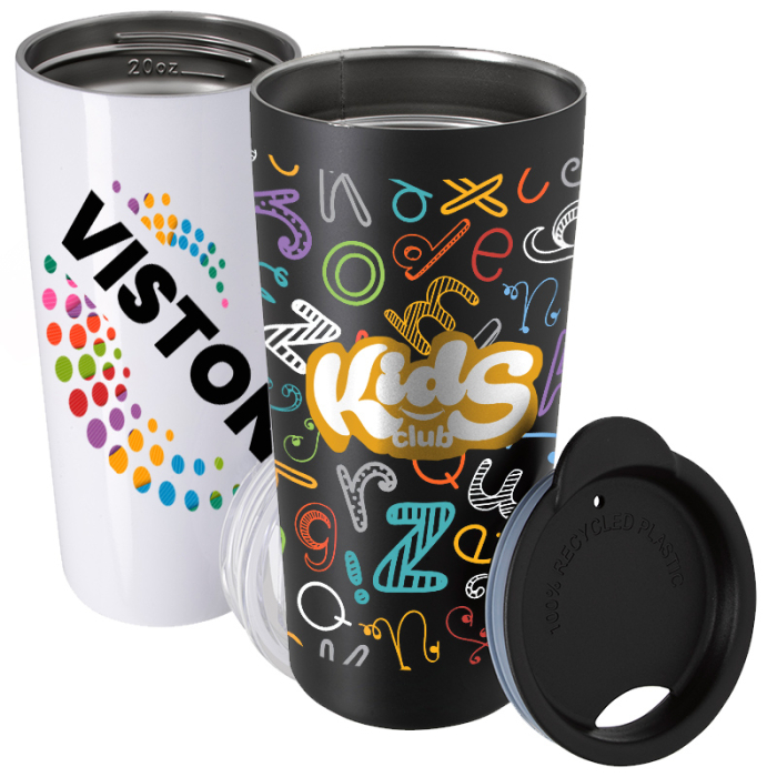Made with 90% recycled stainless steel and a 100% recycled plastic lid, this 16 oz tumbler combines sustainability with performance. Its double-wall vacuum insulation keeps drinks hot or cold for hours, and the drink-thru lid offers easy, spill-resistant sipping. Holds up to 19 oz when filled to the rim.Order these  travel tumblers right away to get free design, free online proofs and fastest turnaround offers.
