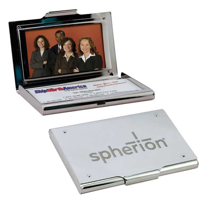 Personalized Business Card Holders with Photo Frame are a practical and stylish way to keep business cards organized while adding a personal touch. Made from durable nickel-plated material with a polished silver finish, this holder combines elegance with everyday functionality. The built-in photo frame allows for personalization with a photo, logo, or message, making it a memorable desk accessory. Compact and professional, it fits perfectly on desks, counters, or in briefcases, keeping cards neat and easily accessible. Perfect for corporate gifts, trade shows, or client appreciation, this business card holder delivers lasting utility while keeping your brand in view.Looking for more? Explore our collection of business card holders right away.Get free design, free online proofs and fastest turnaround offers.