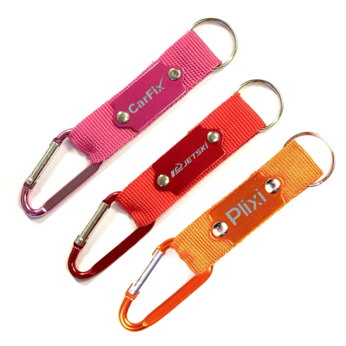 Request a quote to know wholesale savings for Personalized Carabiners with Strap and Metal Plate.