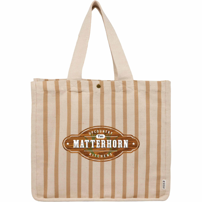 Personalized FEED Striped Carry Totes provide a practical and stylish option for everyday errands, work, or school. Crafted from an 11oz blend of cotton and jute, the tote offers durable construction that can withstand frequent use while maintaining an eco-conscious footprint. Inside, a printed FEED giveback message communicates the brand’s charitable mission, making the tote a conversation starter and meaningful gift. A secure brass snap closure with the FEED logo keeps belongings safe, while 9-inch drop handles ensure comfortable carrying by hand or over the shoulder. The on-trend stripe design adds a modern and versatile aesthetic, making this tote suitable for a wide audience. Ideal for corporate gifting, fundraising campaigns, and promotional events, it’s a functional and stylish item that reflects both your brand and a commitment to giving back.Looking for more? Explore our collection of custom tote bags right away.Get free design, free online proofs and fastest turnaround offers.