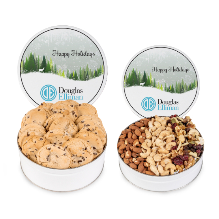 Personalized Fresh Beginnings Gourmet Duet Towers make a refined and thoughtful gift for any occasion. Featuring a premium mix of roasted nuts paired with freshly baked chocolate chip cookies, this two-tier tower offers balance, variety, and visual appeal. Ideal for corporate gifting, client appreciation, holiday celebrations, or employee recognition, each tin provides a satisfying snack experience while showcasing your brand in style. The stacked design enhances presentation, making this gift both impressive and memorable.Order these food & candy gifts  right away to get free design, free online proofs, and fastest turnaround offers.