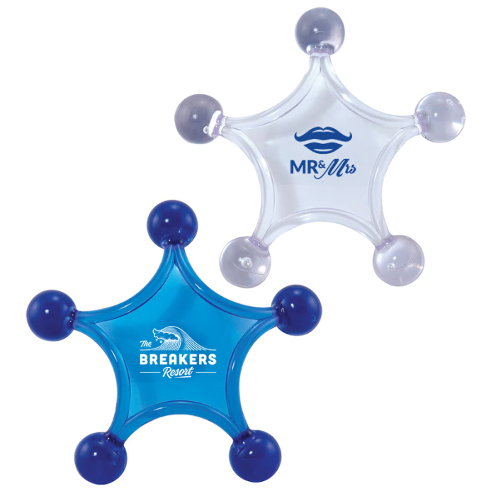 Personalized Large Star Massagers are a practical wellness accessory designed to deliver smooth, comfortable relief wherever it’s needed. The lightweight construction allows for easy handling, while the large star-shaped design glides effortlessly along the body to help ease muscle tension and promote relaxation. Ideal for offices, wellness programs, health fairs, or promotional giveaways, this massager is a useful item recipients can incorporate into their daily routines. Available in clear and translucent blue, it offers a clean, professional look that pairs well with custom branding. With its compact 6-inch diameter, this massager is easy to store, travel with, and use anytime stress relief is needed.Looking for more? Explore our collection of massagers  right away.Get free design, free online proofs and fastest turnaround offers.