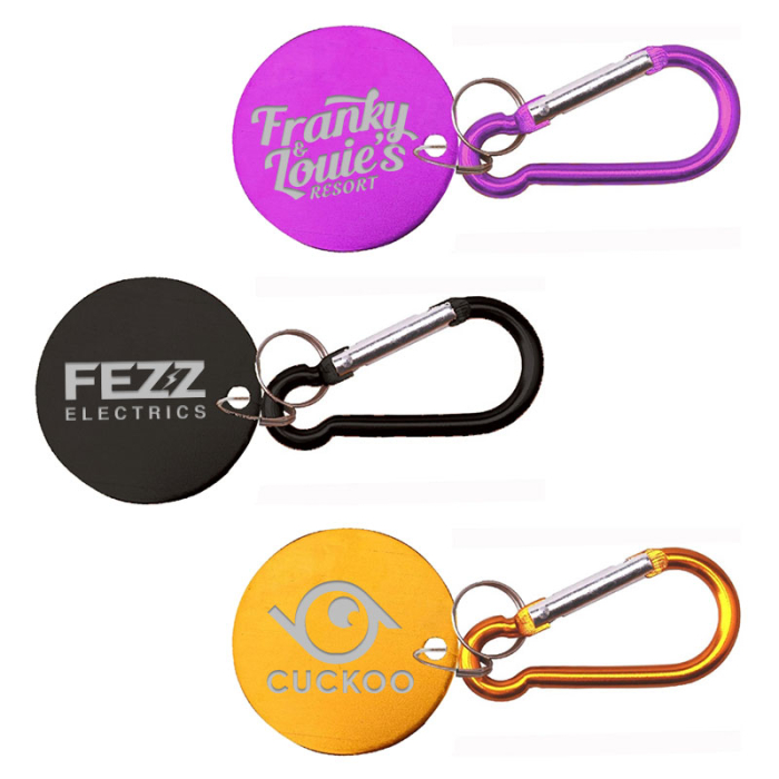Personalized Round Shaped Aluminum Key Holders and Dog Tags offer a clean, modern way to highlight your brand on an item people use daily. Crafted from solid aluminum with a metallic finish, this round tag is both lightweight and durable, making it ideal for keys, backpacks, and pet collars. The attached carabiner allows quick and secure fastening to bags, zipper pulls, and travel accessories. Its smooth circular surface provides ample space for laser-engraved branding, identification details, or promotional messaging. Perfect for events, giveaways, pet-related promotions, or everyday corporate branding, this versatile tag ensures your imprint stays visible wherever it goes. Order these  metal keychains right away to get free design, free online proofs and fastest turnaround offers.